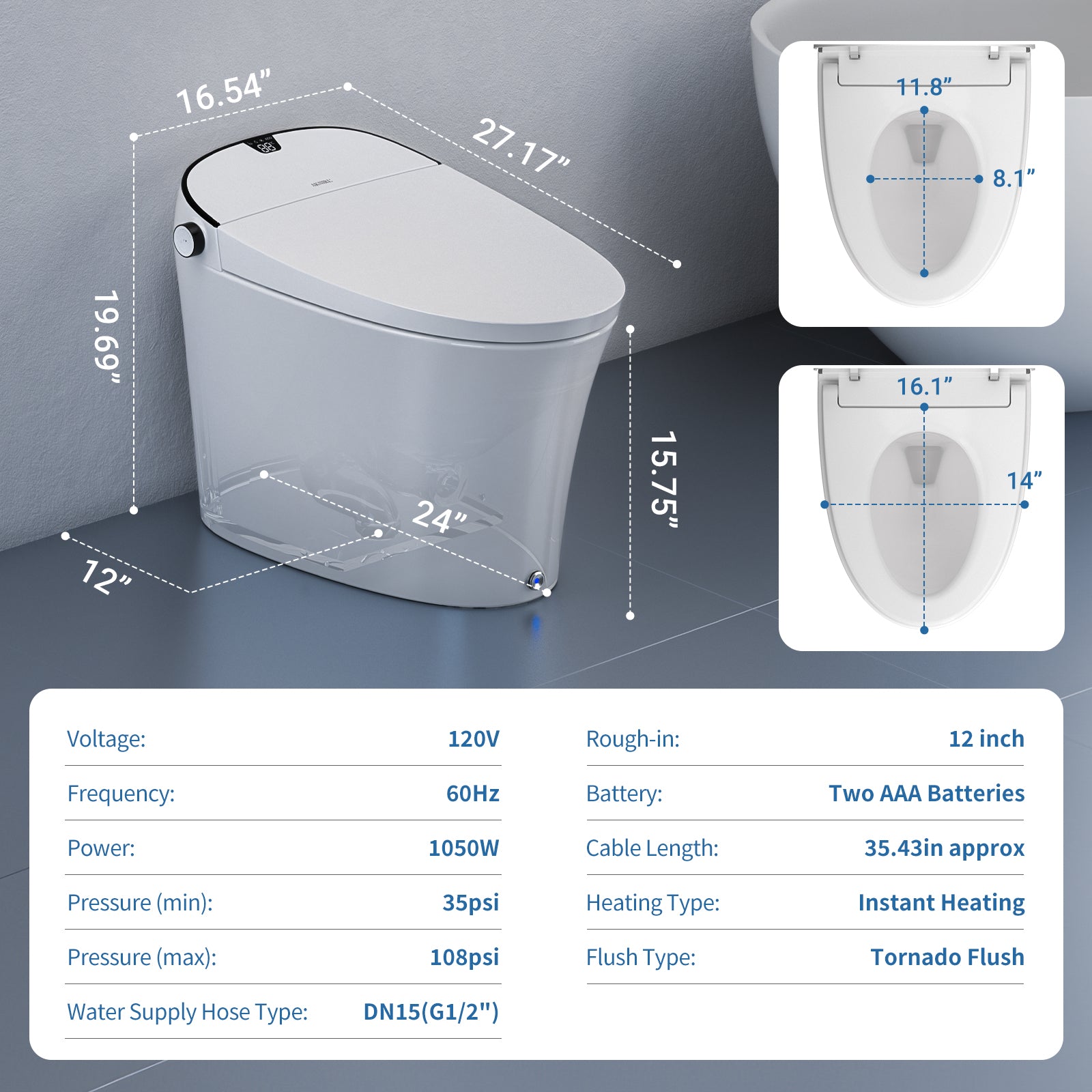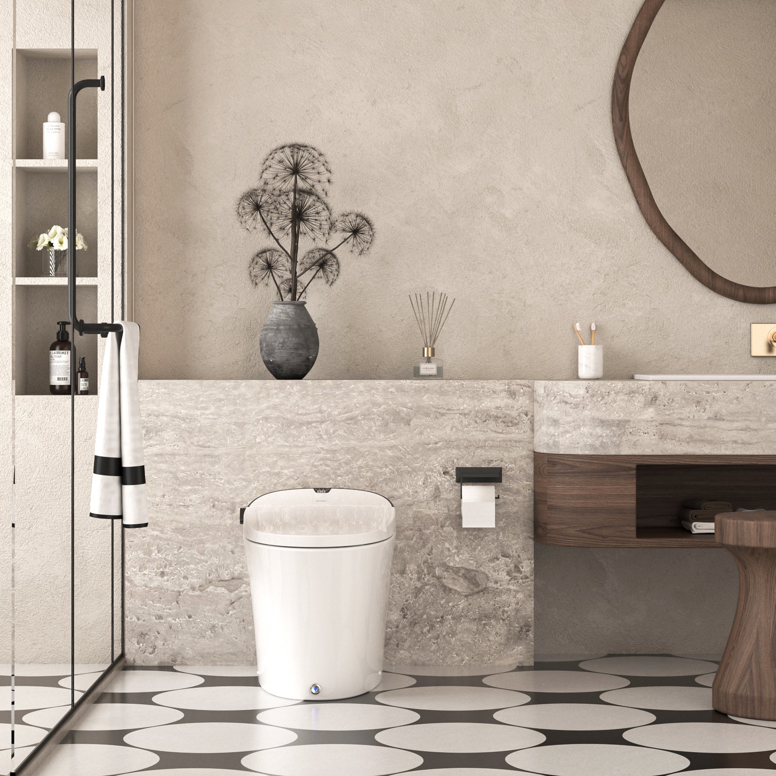 Modern Toilet: Tankless white ceramic toilet, stylish and simple, suitable for various bathroom styles and sizes; Comes with a remote control, white plastic panel, crisp function buttons, easy to hold and operate, powered by two AAA batteries (included)