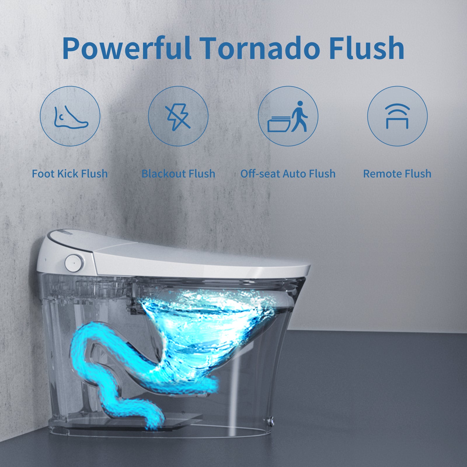 Automatic Flushing: Built-in a tank, no need to worry about insufficient water pressure, enjoy strong flushing; Touchless automatic flushing experience, pre-wetting after sitting, foot induction rinsing and off-seat rinsing after business, rinsing thoroughly and saving water